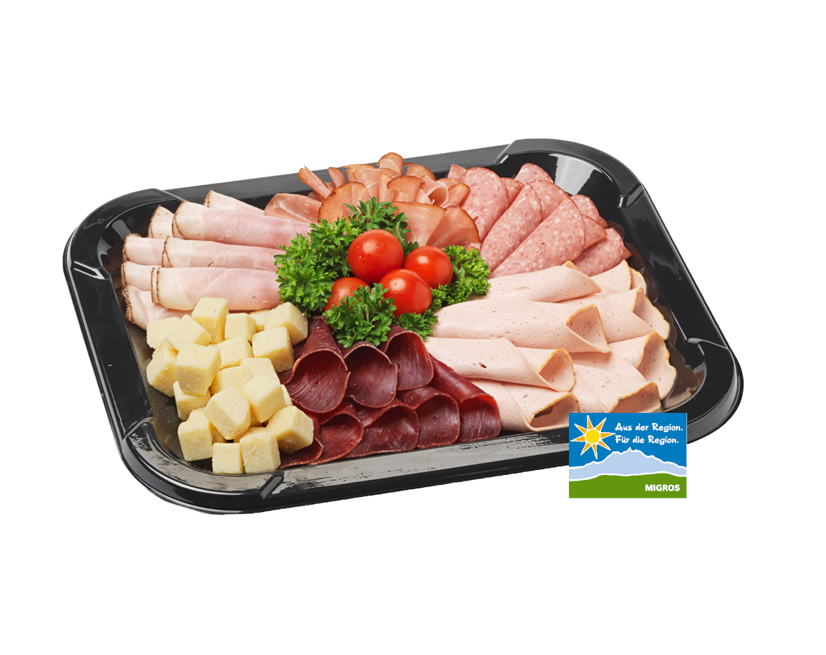 Appenzellerkäse* 19.9% (Milch 98.5 %, Salz, Lab, Kulturen), Fleischkäse* 19.9% (Schweinefleisch, Speck, Wasser, Schwarten (mit Kochsalz jodiert), Nitritpökelsalz (Kochsalz, Konservierungsstoff: Natriumnitrit), Milchprotein, Milchzucker, Stabilisator: Diphosphat, Gewürze, Geschmacksverstärker: Mononatriumglutamat, Antioxidationsmittel: Ascorbinsäure, Gewürzextrakt), Krustenschinken* 19.3% (Schweinefleisch, Nitritpökelsalz (Kochsalz, Konservierungsstoff: E 250), Gewürzextrakte, Maltodextrin, Hefeextrakt, Bouillon (Rapsöl, Würze, Kochsalz), Traubenzucker, Stabilisator: E 451, Antioxidationsmittel: E 301, Aromen), Rheintaler Bauernbratwurst* 11.6% (Rindfleisch, Schweinefleisch, Speck, Nitritpökelsalz (Kochsalz, Konservierungsstoff: Natriumnitrit), Gewürze, Zucker, Rapsöl, Glucose, Antioxidationsmittel: Ascorbinsäure und Zitronensäure, Geschmacksverstärker: Mononatriumglutamat, Säuerungsmittel: Glucono-delta-Lacton, Stabilisatoren: Diphosphate und Polyphosphate, Aroma, Bündnerfleisch* 10.8% (Rindfleisch, Kochsalz, Gewürze, Gewürzextrakt, Glucose, Zucker, Konservierungsstoff: Kaliumnitrat, Antioxidationsmittel: Natriumascorbat und Natriumcitrate), Rauchmöckli* 10.8%(Schweinefleisch, Kochsalz, Gewürze, Glucose, Zucker, Geschmacksverstärker: Mononatriumglutamat, Antioxidationsmittel: Natriumascorbat, Säuerungsmittel: Natriumcitrate, Konservierungsstoff: Kaliumnitrat), Cherry-Tomaten, Petersilie. *aus der Region (CH)